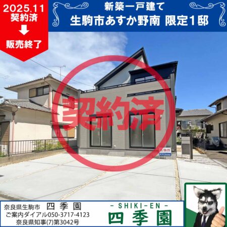 販売終了/生駒市あすか野南3丁目、長期優良住宅で耐震3(最高等級)の新築一戸建て白庭台駅南部にある大型住宅地「あすか野南」にある日当たり良好で駐車3台の長期優良住宅!耐震3(最高等級)で家族を守る家!