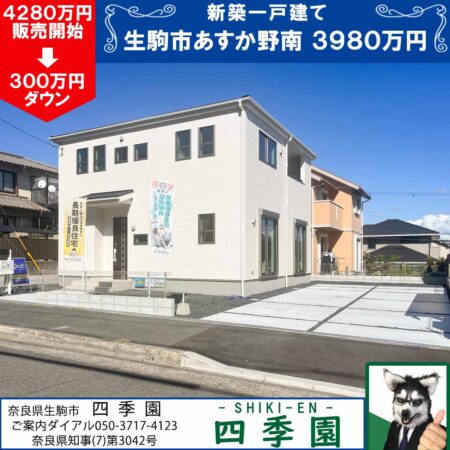 生駒市あすか野南、庭付き一戸建てならココ!長期優良住宅で耐震3(最高等級)の家!庭付き一戸建てをお探しならココ!日当たりの良い広い庭付き駐車4台OK!長期優良住宅で耐震3(最高等級)の家!