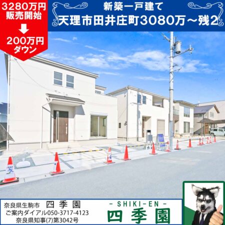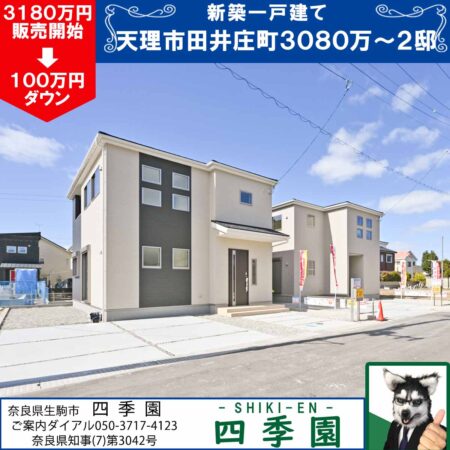 天理市田井庄町2期、スーパに徒歩3分!長期優良住宅で耐震3(最高等級)で地震に強い家!スーパに徒歩3分は便利すぎ!造成地で前道6mで広々!長期優良住宅で耐震3(最高等級)で地震に強い家!