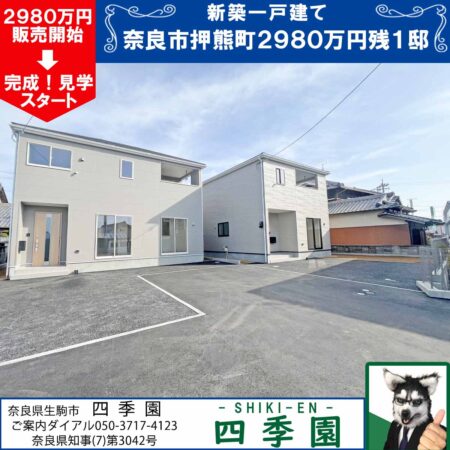 奈良市押熊町第3、駐車2台の日当たり良好な新築一戸建て!耐震3(最高等級)の地震に強い家!南向きで日当たり良好!大型車OK駐車2台で庭付きの新築一戸建て!耐震3(最高等級)で地震に強い家!