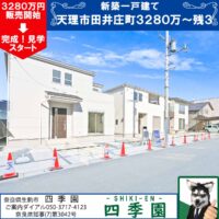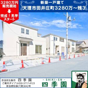 天理市田町、駐車3台の日当たり良好な新築一戸建て!家は耐震3(最高等級)の性能住宅!西側の「鎮守の森」が癒されロケーション!日当たり良好な大型車OKの駐車2~3台可能なマイホーム!耐震3(最高等級)の新築一戸建て!