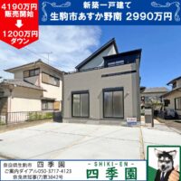 場所は奈良県生駒市北大和(きたやまと)4丁目という近鉄けいはんな線「学研北生駒駅」から徒歩15分の地域です。生駒市の北部に広がる閑静な住宅街にあります。道路は約6.2mと広く、整然とした街並みとなっています。正直なところ高級住宅街なので建て売りの出現回数は少ない地域です。 今回の物件の敷地は54坪となっており、駐車も3台可能な物件となっています。南側にも庭スペースがあり、開放的な雰囲気を作っています。