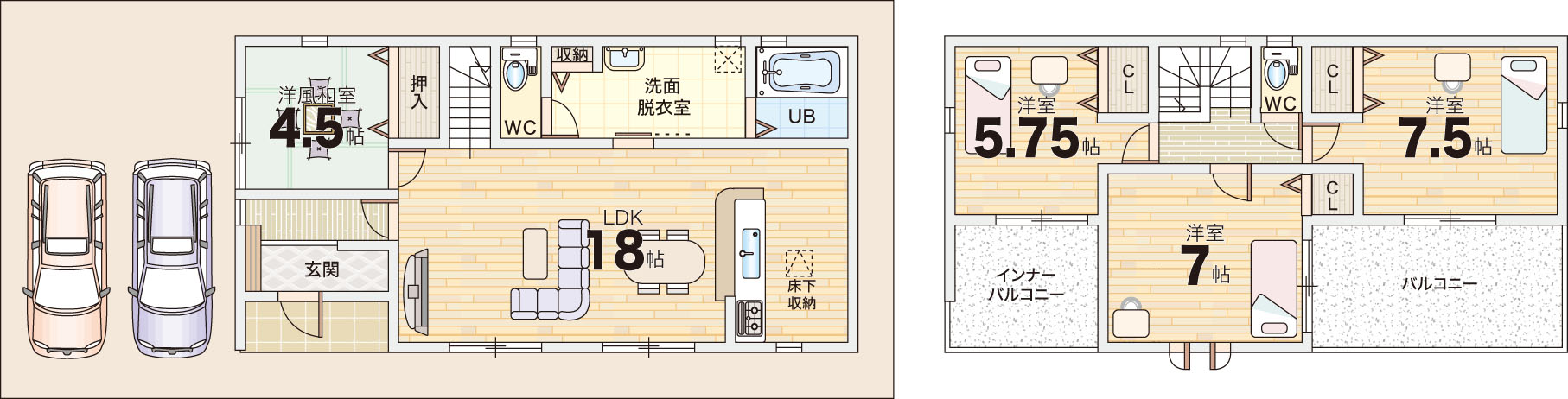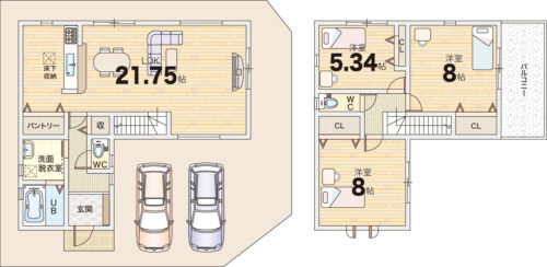 18帖超のLDKを中心に、家族の会話が自然と生まれる対面キッチンを採用し、収納力にも優れた実用的な間取り設計。省エネ性能を示すBELS評価も取得しており、家計にも環境にも配慮されています。
