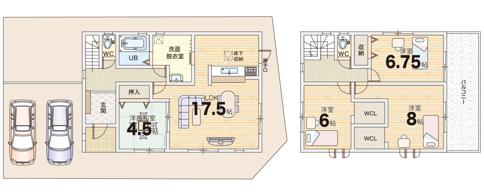 駐車スペースは並列2台分を確保しており、出し入れもスムーズで日常使いに便利です。