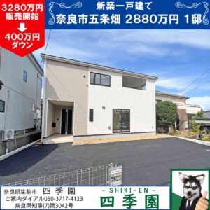 場所は奈良県奈良市東九条町(とうくじょうちょう)というJR関西本線「奈良駅」へバス14分停歩6分の地域です。奈良市の南側郊外となりますが、この地域にはファミリー向け賃貸も多く、よって建て売り新築も多く建築される地域です。周辺にはスーパーや買い物施設が充実しており、学校もバランスよく配置されています。しかも今回の物件は全室南向きとたいへん日当たり良好な物件となっています。